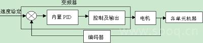 控制原理框圖如圖3所示。其原理是(1)速度給定信號由PLC通過運算后由PROFIBUS總線送給各單元變頻器;(2)利用變頻器內(nèi)置PID功能完成PI調(diào)節(jié),在實際運行中可根據(jù)運行情況適當改變;(3)編碼器選用日本光洋高可靠性集電極開路輸出型旋轉(zhuǎn)編碼器,1000P/R,從而實現(xiàn)閉環(huán)運行。