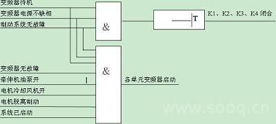 變頻器的啟停控制的啟??刂频倪壿媹D如圖四所示,各單元機變頻器的啟停均由“變頻器無故障”、“牽伸機油泵開”、“電機冷卻風(fēng)機開”、“電機脫離制動”、“系統(tǒng)已啟動”五路信號控制,五路信號的邏輯控制由PLC完成,再由PLC輸出信號控制各單元變頻器。