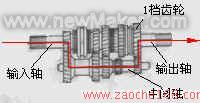 當(dāng)汽車啟動司機(jī)選擇1檔時,撥叉將1/2檔同步器向后接合1檔齒輪并將它鎖定輸出軸上,動力經(jīng)輸入軸、中間軸和輸出軸上的1檔齒輪,1檔齒輪帶動輸出軸,輸出軸將動力傳遞到傳動軸上(紅色箭頭)。典型1檔變速齒輪傳動比是3:1,也就是說輸入軸轉(zhuǎn)3圈,輸出軸轉(zhuǎn)1圈。