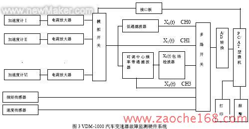 VDM-1000 汽車變速器故障監(jiān)測(cè)系統(tǒng)是采用單臺(tái)微機(jī)進(jìn)行數(shù)據(jù)采集、數(shù)據(jù)處理、數(shù)據(jù)及處理結(jié)果的顯示與打印。具體來說,該系統(tǒng)的硬件主要由傳感器(加速度、扭矩、轉(zhuǎn)速)及其適調(diào)放大器、多路開關(guān)、濾波器、A/D 板、AT 微機(jī)及其外設(shè)等組成,見圖3。