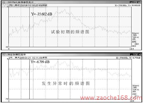 經(jīng)過60h 試驗(yàn)后,通過故障診斷系統(tǒng)的計(jì)算機(jī)顯示,在第二通道發(fā)出警告信息,進(jìn)行頻譜分析,發(fā)現(xiàn)譜圖顯示的能量增加(對(duì)比于試驗(yàn)初期時(shí)的能量),對(duì)比圖形見圖4。初步判定為一軸軸承發(fā)生故障,及時(shí)停機(jī)進(jìn)行變速器拆檢,果然為一軸軸承由于安裝不當(dāng)造成偏磨,從而引起內(nèi)圈磨損。及時(shí)更換該軸承,保證試驗(yàn)順利進(jìn)行。