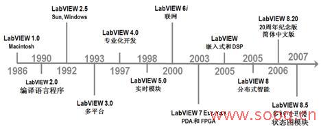 LabVIEW從最初就被設(shè)計(jì)為一種強(qiáng)大的高層架構(gòu)型編程語(yǔ)言,自1986年1.0版誕生以來(lái),縱觀其20多年的發(fā)展(圖1),可以發(fā)現(xiàn),每次LabVIEW的主要升級(jí)版本的發(fā)布都包含了很多全新的特性。