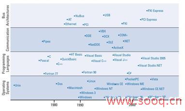 LabVIEW 3.0首次實(shí)現(xiàn)了多平臺(tái)兼容的特性,保證相同的代碼可以運(yùn)行在多個(gè)操作系統(tǒng)中;LabVIEW 5則推出了實(shí)時(shí)(Real Time)模塊,允許工程師們將在主機(jī)上開(kāi)發(fā)的LabVIEW代碼進(jìn)行自動(dòng)編譯,使其運(yùn)行在實(shí)時(shí)硬件對(duì)象中。通過(guò)降低在實(shí)時(shí)系統(tǒng)中部署代碼的復(fù)雜度,這個(gè)創(chuàng)新的理念幫助工程師以一種更方便的方式進(jìn)行控制應(yīng)用的開(kāi)發(fā);而LabVIEW 7與FPGA技術(shù)的結(jié)合則又是該理念的進(jìn)一步升華,從而讓不具備VHDL編程經(jīng)驗(yàn)的工程師們也同樣可以進(jìn)行硬件設(shè)計(jì),并且LabVIEW本質(zhì)上的數(shù)據(jù)流并行性非常符合FPGA并行電路特性,在此基礎(chǔ)上可以達(dá)到很好的空間利用和定時(shí)性能;LabVIEW 8.2作為20周年的紀(jì)念版,首次推出了中文版,使中國(guó)工程師們也能用自己的母語(yǔ)編程,最大程度地提升開(kāi)發(fā)效率;最新的LabVIEW 8.5則更為多核處理器技術(shù)提供了強(qiáng)有力的支持,同時(shí)也推出了基于UML語(yǔ)言規(guī)范的狀態(tài)圖設(shè)計(jì)模塊。綜合而言,LabVIEW通過(guò)不斷地融入最新商業(yè)可用技術(shù)(圖2),讓使用者無(wú)需花費(fèi)過(guò)多的精力去學(xué)習(xí)每個(gè)技術(shù)的細(xì)節(jié)就可以直接使用,提升了系統(tǒng)的性能,保證了工程師們長(zhǎng)期的投資。