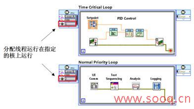 相比之下,LabVIEW由于其本身就是一種并行的編程結(jié)構(gòu),因此非常適合于創(chuàng)建并行的多線程應(yīng)用;而在LabVIEW 5時(shí)就開(kāi)始支持多線程,編譯器可以自動(dòng)識(shí)別線程并創(chuàng)建線程到不同的任務(wù)和循環(huán)上,再由操作系統(tǒng)分配到不同的核上運(yùn)行(圖6)。