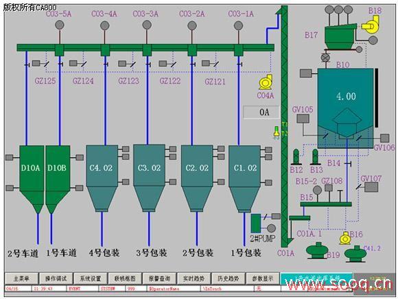 監(jiān)視功能:系統(tǒng)按工藝流程分1#~4#入庫系統(tǒng)、1#~4#出庫配倉系統(tǒng)、散料出庫系統(tǒng)、包裝出庫系統(tǒng)和配倉總流程共十二個配送流程畫面實時顯示和監(jiān)視各流程的運行工況,通過動態(tài)、變色、閃爍、數(shù)字、棒圖及曲線的方式實時監(jiān)視各電氣設(shè)備、工藝參數(shù)的工況,全中文界面。同時可調(diào)出以分畫面或彈出窗口的形式顯示的各設(shè)備信號狀態(tài);如圖3,為系統(tǒng)流程監(jiān)控畫面之一。