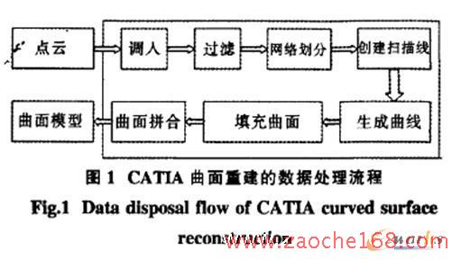 在點(diǎn)云數(shù)據(jù)取得后,就可以利用三維造型軟件CATIA進(jìn)行后續(xù)工作,構(gòu)造出我們需要的產(chǎn)品形狀。利用CATIA中的數(shù)字曲面編輯器(Digitized Shape EditorDSE),創(chuàng)成式外形設(shè)計(jì)(Generative Shape Design GSD),決速曲面重建(Quick Surface Reconstruction QSR),白由曲面造型(Freestyle FS)等模塊,通過(guò)點(diǎn)云處理、曲面重構(gòu)與光順、曲面數(shù)據(jù)質(zhì)量評(píng)估等一系列操作得到高質(zhì)量的曲面。其具體的處理流程如圖I所示。