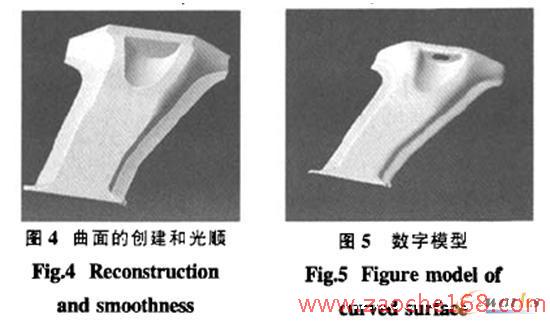 由于曲面的填充不是一次性完成的,在曲面填充時(shí)會(huì)產(chǎn)生縫隙.這些曲面要經(jīng)延伸、裁剪、過(guò)渡后才可拼合成一張完整的曲面模型;并且曲面的連接時(shí)要考慮曲率的連續(xù),因此要用過(guò)渡曲面將光順好的曲面連接起來(lái)。過(guò)渡曲面分為兩類,一類是各種倒圓〔等半徑和變半徑),另一類是兩個(gè)或多個(gè)主要曲面的相接曲面,以保證各個(gè)面的曲率連續(xù)。在本實(shí)例中運(yùn)用Blend功能做出過(guò)渡曲面,再?gòu)牟煌暯沁M(jìn)行光順處理以確保滿足設(shè)計(jì)要求。如圖4所示,是將填充后的曲面經(jīng)過(guò)拼合等處理后得到的內(nèi)飾件數(shù)字模型。