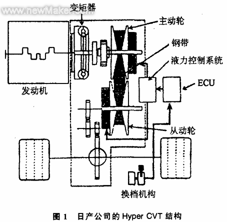 1997年上半年,日本日產(chǎn)公司開(kāi)發(fā)了使用在2.0L汽車上的CVT。在此基礎(chǔ)上,日產(chǎn)公司在1998年開(kāi)發(fā)了一種為中型轎車設(shè)計(jì)的包含一個(gè)手動(dòng)換檔模式的CVT。新型CVT采用一個(gè)最新研制的高強(qiáng)度寬鋼帶和一個(gè)高液壓控制系統(tǒng)。通過(guò)采用這些先進(jìn)的技術(shù)來(lái)獲得較大的轉(zhuǎn)矩能力,日產(chǎn)公司研究開(kāi)發(fā)CVT的電子控制技術(shù),傳動(dòng)比的改變實(shí)行全檔電子控制,汽車在下坡時(shí)可以一直根據(jù)車速控制發(fā)動(dòng)機(jī)制動(dòng),而且在濕滑路面上能夠平順地增加速比來(lái)防止打滑。日產(chǎn)公司計(jì)劃將它的CVT的應(yīng)用范圍從1.0 L擴(kuò)大到3.0L的轎車。