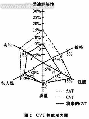 在最近的十幾年中,CVT技術(shù)已經(jīng)向前邁進(jìn)了一大步,使得CVT比有著超過(guò)100年歷史的機(jī)械變速器(MT)和有著超過(guò)50年歷史的自動(dòng)變速器(AT)更有競(jìng)爭(zhēng)力。CVT技術(shù)正處在壽命周期的開(kāi)始,CVT的特性將進(jìn)一步提高,圖2顯示出CVT的未來(lái)潛力。