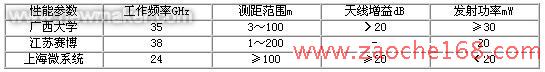 廣西大學(xué)計算機與信息工程學(xué)院及華中理工大學(xué)電信系共同研制的一種毫米波汽車?yán)走_(dá)系統(tǒng)采用線性調(diào)頻連續(xù)波(LFM-CW) 雷達(dá)體制,發(fā)射頻率按周期性三角波調(diào)制,前端主要包括收發(fā)天線、定向耦合器、混頻器、調(diào)頻振蕩器,控制單元部分用單片機系統(tǒng)實現(xiàn),由NRD波導(dǎo)構(gòu)成的集成收發(fā)前端及小型化菲涅爾天線。中國科學(xué)院上海微系統(tǒng)所研制出的毫米波雷達(dá)系統(tǒng)具有重量輕、體積小和全天候等特點,工作頻率35GHz,測距范圍>100m,測速范圍>100km/h,采用了先進(jìn)的DSP技術(shù)。江蘇賽博電子有限公司與大專院校合作,研制成功的汽車?yán)走_(dá)防撞系統(tǒng)使用38G毫米波技術(shù)和高速DSP數(shù)字信號處理器。監(jiān)視前向車道上靜止的和行駛的車輛,提供20個目標(biāo)的距離和接近速度數(shù)據(jù)判斷潛在碰撞危險目標(biāo),虛警率為1‰,最小為1米。
