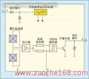 如圖1所示,一個(gè)施密特觸發(fā)器用來對該信號進(jìn)行數(shù)字化,一個(gè)開集電極輸出電路提供輸出信號。芯片上還集成了過壓保護(hù)、反極性保護(hù)和抗電磁干擾功能,因而可以應(yīng)用在汽車中常見的惡劣環(huán)境。
