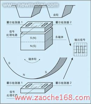 對于差值信號的生成和評估,這里可以一個(gè)感應(yīng)鐵磁齒輪這樣的典型應(yīng)用來解釋。安裝在器件背面任何一端的一個(gè)永久磁體產(chǎn)生一個(gè)恒定的偏置磁場,器件內(nèi)的兩個(gè)霍爾傳感器相隔2.5毫米。如果一個(gè)傳感器暫時(shí)面對一個(gè)輪齒而另一個(gè)面對齒隙,那么該輪齒將作為一個(gè)磁通量聚集器,它通過該霍爾傳感器增加了磁通密度,由此產(chǎn)生一個(gè)差分信號。隨著齒輪的轉(zhuǎn)動,該差分信號的極性將改變,改變的速度同輪齒與齒隙之間變換的速度一樣。