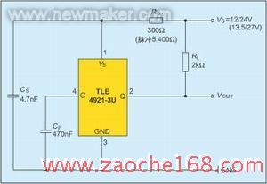 圖3所示為采用TLE 4921-3U的測量電路。濾波電容CF(470nF)直接連到管腳4,另外在供電線路上加一個(gè)旁路電容(CS=4.7nF),并采用一個(gè)300Ω的串聯(lián)電阻(測試脈沖5采用400Ω電阻)。某些應(yīng)用不允許這樣高的串聯(lián)電阻,因?yàn)闀鸸╇婋妷合陆?。如果采?/SPAN>50到150Ω的較小串聯(lián)電阻,那么幾乎不會對下面的結(jié)果產(chǎn)生影響,僅對脈沖5會有些影響。由于其長達(dá)400ms的持續(xù)時(shí)間,這種所謂的負(fù)載突降(load-dump)脈沖會使TLE 4921-3U器件產(chǎn)生很高的功耗。如果沒有一個(gè)足夠大的串聯(lián)電阻,該器件也許會損壞。因此,最小的電阻必須適應(yīng)有關(guān)應(yīng)用的負(fù)載突降需求,反之亦然。另一種可供選擇的方法是在供電線路上加一個(gè)抑制二極管,這樣就不必采用大串聯(lián)電阻。