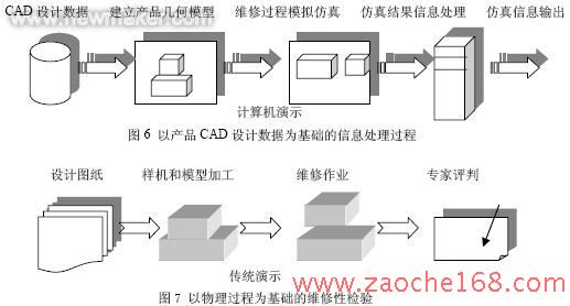 由圖3和圖5所示情況可以看出計(jì)算機(jī)演示與傳統(tǒng)演示雖然都是通過(guò)維修操作過(guò)程試驗(yàn)檢驗(yàn)產(chǎn)品的維修性,但是其過(guò)程已經(jīng)發(fā)生了很大變化。兩者的主要差別是計(jì)算機(jī)演示用計(jì)算機(jī)圖形模型代替了產(chǎn)品模型和樣機(jī),用計(jì)算機(jī)人體模型代替了維修人員,用維修過(guò)程計(jì)算機(jī)仿真代替了實(shí)際維修過(guò)程,用計(jì)算機(jī)專家系統(tǒng)代替了實(shí)際專家指導(dǎo),用計(jì)算機(jī)模擬維修環(huán)境代替了實(shí)際模擬維修環(huán)境。一句話,傳統(tǒng)演示是在真實(shí)的物理?xiàng)l件下進(jìn)行,而計(jì)算機(jī)演示只是在計(jì)算機(jī)上進(jìn)行。這些改變使得過(guò)程的性質(zhì)發(fā)生了根本的改變,這種改變是一種質(zhì)的飛躍。原來(lái)主要以物理過(guò)程為特征的傳統(tǒng)演示過(guò)程變?yōu)橐援a(chǎn)品CAD設(shè)計(jì)數(shù)據(jù)為基礎(chǔ)的信息處理過(guò)程,兩個(gè)過(guò)程的對(duì)比如圖6和圖7所示。