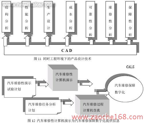 (2)汽車維修性計(jì)算機(jī)輔助分析(Car MCAE)和汽車全數(shù)字設(shè)計(jì)河開(kāi)發(fā)是在同時(shí)工程環(huán)境下進(jìn)行產(chǎn)品設(shè)計(jì)的一項(xiàng)重要技術(shù)(參閱圖11),圖中所示內(nèi)容也表明其設(shè)計(jì)流程和兩者之間的關(guān)系也很明確。同時(shí),汽車維修性計(jì)算機(jī)輔助分析也是汽車維修與保障系統(tǒng)Car CALS發(fā)展的一個(gè)重要基礎(chǔ)(參閱圖12)。