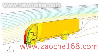 對于產(chǎn)品車,通過適當(dāng)加裝導(dǎo)流罩、導(dǎo)流板等措施,可以大幅度降低其阻力系數(shù)。圖3為某產(chǎn)品車加裝導(dǎo)流罩后CFD分析的結(jié)果。計(jì)算表明,加導(dǎo)流罩后,阻力系數(shù)可降低15-20%。