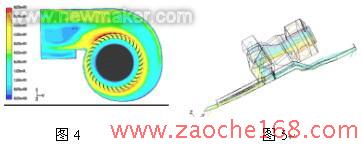 為保證空調(diào)系統(tǒng)設(shè)計(jì)合理,對空調(diào)系統(tǒng)進(jìn)行CFD分析是經(jīng)濟(jì)有效的手段。空調(diào)系統(tǒng)氣流的走向?yàn)椋猴L(fēng)機(jī)→三箱總成→風(fēng)道→各出風(fēng)口。如果其中某個(gè)部分的設(shè)計(jì)不合理,可能導(dǎo)致各出風(fēng)口風(fēng)量差異過大、制冷/制熱風(fēng)量不合理等問題。空調(diào)系統(tǒng)CFD分析可分為風(fēng)機(jī)特性分析、三箱/風(fēng)道流動(dòng)分析兩大類。對風(fēng)機(jī)的CFD分析可以給出其特性曲線,并可對殼體提出改進(jìn)建議。對三箱/風(fēng)道的流動(dòng)分析可以給用各出風(fēng)口風(fēng)量分配的比例關(guān)系,從而及時(shí)對設(shè)計(jì)做出調(diào)整。圖4、圖5分別為一汽技術(shù)中心對空調(diào)風(fēng)機(jī)和三箱/風(fēng)道CFD分析的結(jié)果,通過分析,對原設(shè)計(jì)進(jìn)行了改進(jìn),提高了設(shè)計(jì)質(zhì)量。