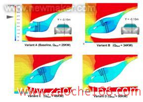 圖6是Opel公司用CFD分析優(yōu)化機(jī)艙和進(jìn)口格柵形狀的情況(右下角為最后結(jié)果)。