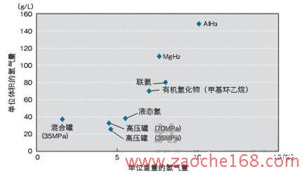 AlH3MgH2無(wú)論單位體積還是單位重量的氫元素密度均較高,但估計(jì)實(shí)際配備于車輛時(shí)的充填密度將降至50%左右。另外,估計(jì)聯(lián)氨也將在加水后使用,相應(yīng)地氫元素密度也將下降。液體氫氣、高壓罐及復(fù)合罐的相關(guān)數(shù)值均包含容器重量,這些數(shù)值會(huì)隨廠商的不同而發(fā)生變動(dòng)。