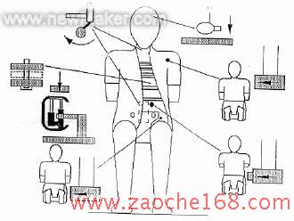 碰撞用試驗(yàn)假人在最初投入使用以及使用過一段時(shí)間以后,為了驗(yàn)證其仿生擬真性能,必須對(duì)假人進(jìn)行標(biāo)定。由于ES-2 型假人作為新的國(guó)際統(tǒng)一性側(cè)撞假人,論文中對(duì)ES-2 假人標(biāo)定方法進(jìn)行了研究設(shè)計(jì)。ECE R95 中以EUROSID-1 型假人為例,對(duì)于在側(cè)面碰撞試驗(yàn)中的假人進(jìn)行了規(guī)范,并對(duì)假人標(biāo)定方法進(jìn)行了詳細(xì)的規(guī)定。需要進(jìn)行標(biāo)定的部位有頭部、頸部、肩部、腰椎、腹部、肋骨和骨盆。如圖8 所示。