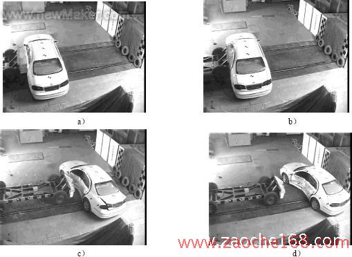 經(jīng)過了充分的理論分析與試驗(yàn)準(zhǔn)備,依據(jù)側(cè)面碰撞法規(guī)進(jìn)行了側(cè)面碰撞的試驗(yàn)。圖10 為試驗(yàn)中移動(dòng)壁和被測(cè)車的運(yùn)動(dòng)情況。其中,圖10a)為碰撞起始時(shí)刻,圖10b)為吸能材料變形結(jié)束,兩車開始一起運(yùn)動(dòng),圖10c)所示為移動(dòng)壁開始制動(dòng),圖10d)所示為被測(cè)車停止運(yùn)動(dòng)的狀態(tài)。