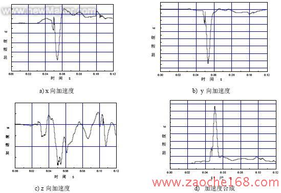 圖11 是車載數(shù)據(jù)采集系統(tǒng)采集到的假人頭部加速度信號(hào)及合成,結(jié)合圖像運(yùn)動(dòng)分析可以看出,頭部加速度峰值出現(xiàn)在碰撞后53ms,是由假人頭部后側(cè)面與B 立柱撞擊產(chǎn)生的。本次試驗(yàn)假人頭部HIC 值計(jì)算結(jié)果為700左右,其他部位傷害指標(biāo)也都滿足側(cè)撞法規(guī)要求。