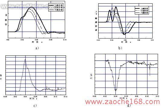 圖12a)和b)所示為假人肋骨變形及其粘性指數(shù)(VC),圖12c)和d)分別為假人腹部力合成和骨盆力。其中比較值得注意的是假人肋骨的變形和粘性指數(shù)。由于本次側(cè)撞試驗(yàn)中使用的是ES-2型側(cè)撞假人,對(duì)比同樣車型中EUROSID-1 假人肋骨數(shù)據(jù)發(fā)現(xiàn),ES-2 假人在試驗(yàn)中所發(fā)生的肋骨傾斜特性會(huì)稍有不同,表現(xiàn)為肋骨變形特性會(huì)稍圓,沒有表現(xiàn)出EUROSID-1 假人的肋骨峰值平緩特性。反映到粘性指數(shù)上,有可能出現(xiàn)兩個(gè)峰值,如圖8 中的上側(cè)肋骨粘性指數(shù)所示。世界范圍內(nèi)關(guān)于ES-2 和EUROSID-1 在整車試驗(yàn)中參數(shù)的研究也在繼續(xù)開展中,特別被關(guān)注的就是肋骨的變形和粘性指數(shù)的比較,更進(jìn)一步的分析還有待于更多試驗(yàn)數(shù)據(jù)的積累。