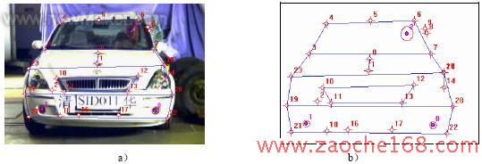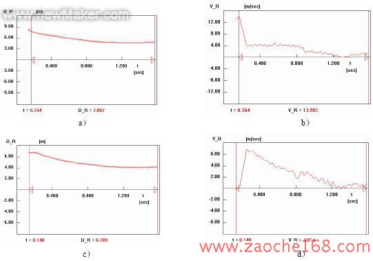 通過圖像分析系統(tǒng)對(duì)試驗(yàn)過程進(jìn)行運(yùn)動(dòng)分析,可以完成對(duì)序列圖像中多個(gè)特定目標(biāo)坐標(biāo)信息的自動(dòng)標(biāo)識(shí)和跟蹤,形成所有目標(biāo)的時(shí)間序列坐標(biāo)庫(kù)。這樣不僅可以方便的以點(diǎn)來(lái)表示目標(biāo),自動(dòng)記錄其坐標(biāo)值,還可以方便的綜合利用點(diǎn)、線、平面和橢圓來(lái)概括抽象出運(yùn)動(dòng)目標(biāo)及其環(huán)境的位移,自動(dòng)記錄其位移關(guān)系形成時(shí)間序列,這樣就可以對(duì)運(yùn)動(dòng)目標(biāo)及其環(huán)境進(jìn)行相對(duì)運(yùn)動(dòng)的分析。圖13 所示為碰撞開始后50ms 的被測(cè)車。跟蹤假人頭部的標(biāo)志橢圓可以看出在碰撞發(fā)生后50ms 左右,假人頭部撞擊到變形內(nèi)陷的B 柱。圖14 是跟蹤車身標(biāo)志點(diǎn)獲得的車速和加速度信息。圖14a)、14b)分別是移動(dòng)壁的位移和速度曲線,圖14c)、14d)分別是被測(cè)車的位移和速度曲線。