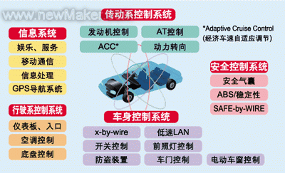 2003年世界汽車產(chǎn)量增長不到3%,其中80%的增量來自中國,中國汽車電子行業(yè)的快速發(fā)展引起了全球汽車電子產(chǎn)業(yè)的關(guān)注。本文概要介紹中國汽車電子技術(shù)和市場的現(xiàn)狀、面臨的困難和發(fā)展的趨勢,以及汽車電源管理器件和技術(shù)的發(fā)展方向,這些內(nèi)容有助于汽車電子設(shè)計工程師、技術(shù)、市場和銷售經(jīng)理以及汽車半導(dǎo)體供應(yīng)商抓住中國汽車電子發(fā)展的機(jī)會。 圖1所示為瑞薩科技對汽車電子系統(tǒng)的劃分示意圖。