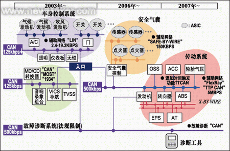 由于汽車電子電器數(shù)量的急劇增多,為了減少連接導(dǎo)線的數(shù)量和車身的重量,網(wǎng)絡(luò)和總線技術(shù)在此期間有了很大的發(fā)展,目的是解決汽車電子子系統(tǒng)的增加帶來的數(shù)據(jù)傳輸?shù)陌踩?、可靠性、車?nèi)線纜總長度太長導(dǎo)致車重增加等問題,并滿足線控汽車的需要。國際汽車巨頭和頂級汽車半導(dǎo)體制造商提出了一系列汽車總線標(biāo)準(zhǔn),包括:IDB-1394和MOST(用于多媒體)、FlexRAY和TTCAN(用于線控)、CAN、IDB-C和GMLAN SWC(用于動力總成控制)、J1850和LIN(用于車身控制)、Keywrod2000和ISO 9141(用于診斷)。圖3所示為現(xiàn)有主流汽車總線標(biāo)準(zhǔn)、用途和速率的簡要說明。