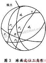 為了保證定位結(jié)果的精確性,系統(tǒng)采用了以原有的思想為基礎(chǔ),但更加完善的多站交會(huì)算法。該算法中的兩兩交會(huì)部分將各種情況(測(cè)向站和輻射源的不同位置關(guān)系)具體表示成了了8種不同的球面定位三角形,其中一種位置關(guān)系及其相應(yīng)公式如下:
