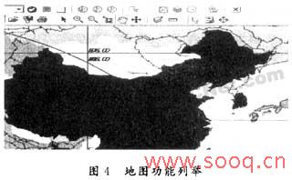 模塊以MapX作為地圖控件,嵌入中國(guó)地圖2002-2003年數(shù)字化電子地圖版作為系統(tǒng)加載的地圖,取國(guó)界、面省界、線省界、海岸線、省會(huì)城市5個(gè)圖層作為加載圖層。采用了刷新速度快的動(dòng)態(tài)圖層(Animation Layer)技術(shù)的電子地圖除了能實(shí)時(shí)標(biāo)識(shí)測(cè)向站,繪畫(huà)示向線,顯示最佳交會(huì)點(diǎn)和誤差概率橢圓外,還能顯示MapInfo格式的地圖數(shù)據(jù),支持地圖的放大、縮小、平移和選擇等操作,圖層的自由控制,簡(jiǎn)單的地理查詢等等。實(shí)例如圖4所示。