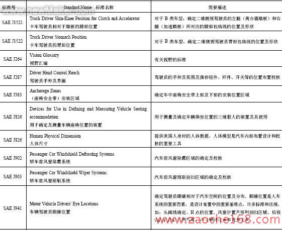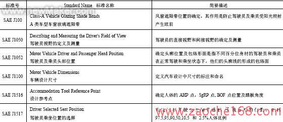 在進行汽車內(nèi)部布置時,SAE 中有如下用于駕駛員和乘員的人體工程學(xué)研究和設(shè)計的相關(guān)標(biāo)準(zhǔn)。