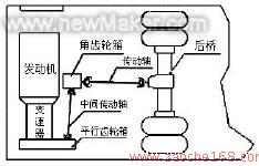 3) 在變速器后裝平行齒輪箱,動力通過中間傳動軸傳遞到獨立的角齒輪箱,再通過傳動軸輸出到后橋,如圖3a 所示。一汽客車底盤廠試制過這種結(jié)構(gòu)的樣車;日本中型客車大部分也采用這一動力傳遞路線,如圖3b 所示。
