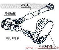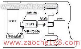 4) 在發(fā)動機離合器后裝平行齒輪箱,動力通過中間傳動軸傳到裝在變速器輸入軸的角齒輪箱再到變速器(變速器縱向布置),然后通過傳動軸到后橋。如圖4 所示。