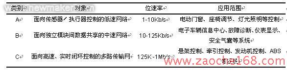 迄今為止,已有Bosch的CAN、SAE的J1850、ISO的VAN、Philips的D2B、LIN協(xié)會的LIN等多種網(wǎng)絡標準。自1980年起,眾多國際知名汽車公司開始積極致力于汽車網(wǎng)絡技術的研究及應用。汽車網(wǎng)絡的使用解決了點對點式車身布線帶來的問題,更使車身布線(趨于)規(guī)范化、標準化,降低了成本,增強了穩(wěn)定性。為方便研究和設計使用,美國汽車工程師協(xié)會(SAE)將汽車網(wǎng)絡根據(jù)速率劃分為A,B,C三類,如表1所示。