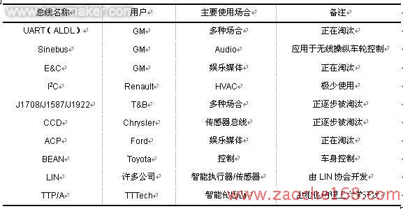 從目前的發(fā)展和使用情況來看(如表2所示),A類網(wǎng)的主要總線是TTP/ A( Time Triggered Protocol/ A)和LI N(Local Interconnect Net-work)。