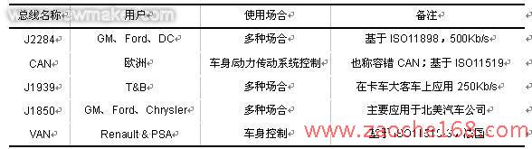 B類網(wǎng)絡的使用情況如表3 所示。從目前來看,主要被應用的B類總線標準有三種:低速CAN、J1850、VAN。