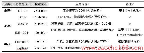 汽車信息娛樂和遠程信息設備,特別是汽車導航系統(tǒng),需要功能強大的操作系統(tǒng)和連接能力。目前主要應用的幾種總線協(xié)議如表6所示。