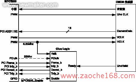 ---圖2是MPC5200與接口芯片和CMOS傳感器的連接圖,顯示了連接到必需的接口邏輯或直接連接到傳感器的MPC520 PCI信號(hào)。圖2中的粗線表示三態(tài)的情形。總線需要外部上拉電阻,這樣在其輸入值中,接口邏輯就會(huì)出現(xiàn)一個(gè)邏輯數(shù)字“1”。