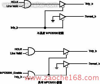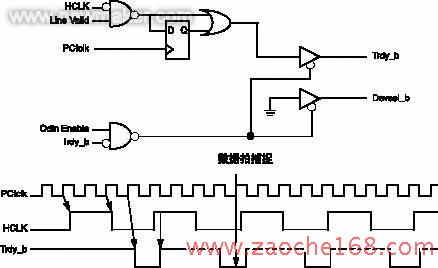 ---如果HCLK與PCIclk的比率為2:1,則PCIclk與接口邏輯的連接就沒(méi)有必要。如果PCIclk與HCLK的比率為4:1的話(人們更期望這樣),需要一個(gè)觸發(fā)器來(lái)延遲和縮短PCI信號(hào)Trdy_b的持續(xù)時(shí)間。