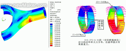 分析表明,橋殼的高應(yīng)力響應(yīng)點(diǎn)在平衡桿加強(qiáng)板和橋殼焊接結(jié)縫,該點(diǎn)非常接近橋殼對焊焊縫與琵琶段闊漲段的三角接板對焊位。從橋殼敏感部位局部的計(jì)算結(jié)果中,可見該段基本上是彎曲工作狀態(tài)。焊點(diǎn)位存在較大的連接力,在橋殼焊縫同一部位的高應(yīng)力響應(yīng)。