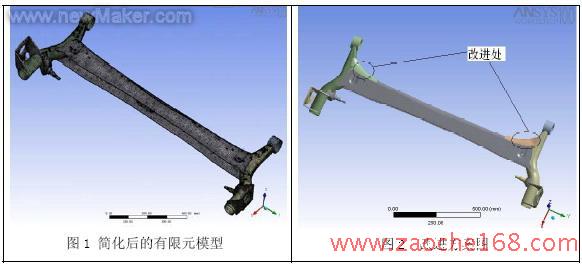 要得到準(zhǔn)確的計(jì)算結(jié)果,那么有限元模型的簡化就要和實(shí)際結(jié)構(gòu)非常的接近。根據(jù)該后橋的特點(diǎn),我們對該橋做了簡化處理,為減小計(jì)算量,省略掉一些對分析結(jié)果影響不大的零件;該橋采用實(shí)體網(wǎng)格劃分,經(jīng)此簡化后的有限元模型共有749486個節(jié)點(diǎn),234506個單元,見圖1。 根據(jù)實(shí)際情況擬定的改進(jìn)方案如圖2。