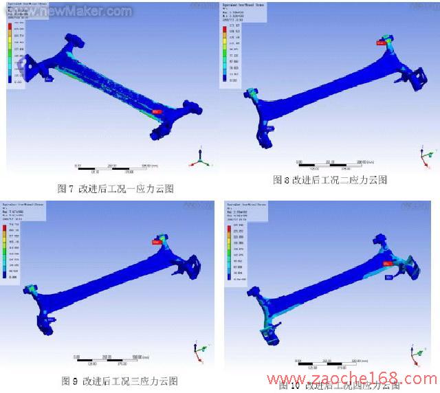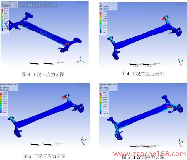 通過強(qiáng)度計(jì)算表明各工況結(jié)構(gòu)應(yīng)力較大的部位主要都出現(xiàn)在橫梁根部,與實(shí)驗(yàn)中出現(xiàn)開裂的部位基本吻合。因此橫梁根部的強(qiáng)度不足是導(dǎo)致該車橋開裂的主要原因。