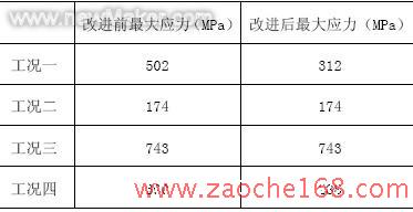 由于本文采用的是線性分析,并且在幾何模型傳遞過程中,由于時間關(guān)系局部存在模型尖角沒有很好處理,因此導(dǎo)致結(jié)果數(shù)值較大,實(shí)際結(jié)構(gòu)不會出現(xiàn)這么大的應(yīng)力值,因此我們只對改進(jìn)前后的最大應(yīng)力值變化進(jìn)行考評,以判斷改進(jìn)方案是否有效可行。改進(jìn)前后最大應(yīng)力值見下表: