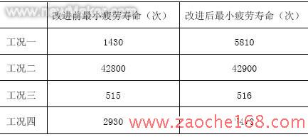 由上表我們可以看出,改進(jìn)后的結(jié)構(gòu)相比原來的結(jié)構(gòu)最大應(yīng)力值下降很多,在實(shí)際工作中經(jīng)常出現(xiàn)的扭轉(zhuǎn)情況最大應(yīng)力值顯著下降,疲勞壽命成倍增長,同時改進(jìn)后的結(jié)構(gòu)在試驗(yàn)過程中也沒再出現(xiàn)早期開裂現(xiàn)象,說明改進(jìn)結(jié)構(gòu)有效可行。