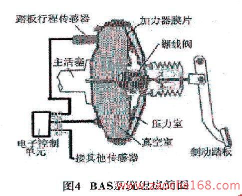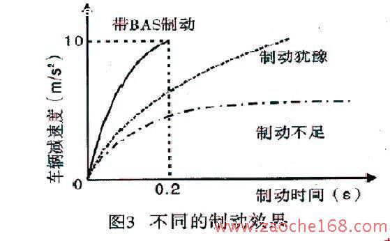 BAS是ABS的有力補(bǔ)充。汽車在緊急情況下,盡管駕駛?cè)藛T做出迅速反應(yīng),但往往不能對制動(dòng)踏板施加足夠的壓力,或者因?yàn)楠q豫而使全力制動(dòng)過遲,甚至做出錯(cuò)誤反應(yīng)。如圖3所示,如果一直用很小的力踩下制動(dòng)踏板,要持續(xù)較長的時(shí)間才能完全制動(dòng),制動(dòng)行程較長,稱為制動(dòng)不足;如果在制動(dòng)的初期用了一個(gè)很小的制動(dòng)踏板力,且這個(gè)力的增加非常緩慢,也使得制動(dòng)起效滯后,稱為制動(dòng)猶豫;而由BAS輔助完成的制動(dòng)效果大不一樣,制動(dòng)作用迅速起效,大大縮短了制動(dòng)距離。BAS根據(jù)駕駛?cè)藛T踩下踏板的力度及速度,將制動(dòng)力適時(shí)加大,從而提供了一個(gè)有效、可靠、安全的制動(dòng)。