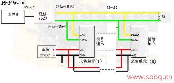 將各個(gè)計(jì)量點(diǎn)的數(shù)據(jù)采集模塊統(tǒng)一掛在地址總線的網(wǎng)絡(luò)上,設(shè)置成不同的地址,通過(guò)RS458/RS232 通信轉(zhuǎn)換模塊,將采集的數(shù)據(jù)傳至計(jì)算機(jī)。計(jì)量監(jiān)控室內(nèi),模塊和單機(jī)的接線連接方式和連接原理見下圖