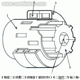 如圖4所示為非接觸式扭矩傳感器的典型結(jié)構(gòu)。輸入軸和輸出軸由扭桿連接起來,輸入軸上有花鍵,輸出軸上有鍵槽。當(dāng)扭桿受方向盤的轉(zhuǎn)動力矩作用發(fā)生扭轉(zhuǎn)時,輸入軸上的花鍵和輸出軸上鍵槽之間的相對位置就被改變了?;ㄦI和鍵槽的相對位移改變量等于扭轉(zhuǎn)桿的扭轉(zhuǎn)量,使得花鍵上的磁感強(qiáng)度改變,磁感強(qiáng)度的變化,通過線圈轉(zhuǎn)化為電壓信號。信號的高頻部分由檢測電路濾波,僅有扭矩信號部分被放大。非接觸扭矩傳感器由于采用的是非接觸的工作方式,因而壽命長、可靠性高,不易受到磨損、有更小的延時、 受軸的偏轉(zhuǎn)和軸向偏移的影響更小,現(xiàn)在已經(jīng)廣泛用于轎車和輕型車中,是EPS傳感器的主流產(chǎn)品。