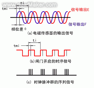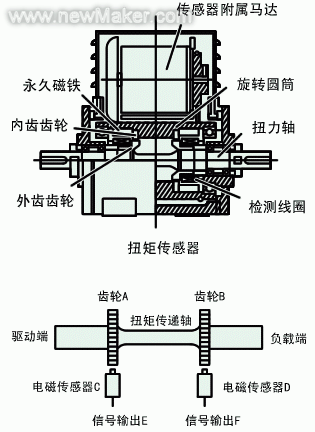 如圖5所示為相位差傳感方式來檢測扭矩的扭矩傳感器的結(jié)構(gòu)和測量原理圖,這種傳感器具有高精度,高重復(fù)性的特點。其測量原理為:在受扭軸的兩端各安上一個齒輪,對著齒面再各裝一個電磁傳感器,從傳感器上就能感應(yīng)出兩個與動力軸非接觸的交流信號。取出其信號的相位差,在這兩個相位差之間,插入由晶體震蕩器產(chǎn)生的高精度,高穩(wěn)定的時鐘信號。以這個時鐘信號為基準(zhǔn),巧妙運用數(shù)字信號處理技術(shù)就能精確地測出所承受的扭矩。